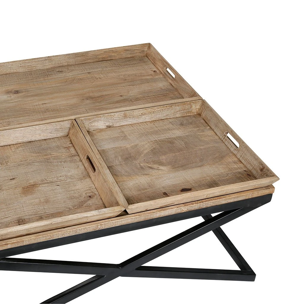 La table basse Noe a un plateau en manguier et une structure en fer qui lui apporte un style industriel.